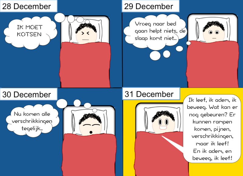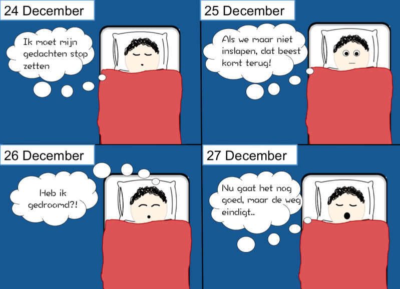 In de onderstaande strip zien we hoe Frits elke avond moeilijk in slaap komt na een "vergooide dag". Op de laatste dag beseft hij dat hij leeft en is hij opgewonden. Ik heb gebruik gemaakt van citaten uit het boek zodat het duidelijk is wat Frits dacht op dat moment. Frits werd bijna elke avond gekweld door nachtmerries. Hij kon nooit goed in slaap komen, hij was niet moe, zijn gedachtes waren te druk of hij was ziek. Behalve op de laatste avond, toen raakte Frits in een diepe slaap.