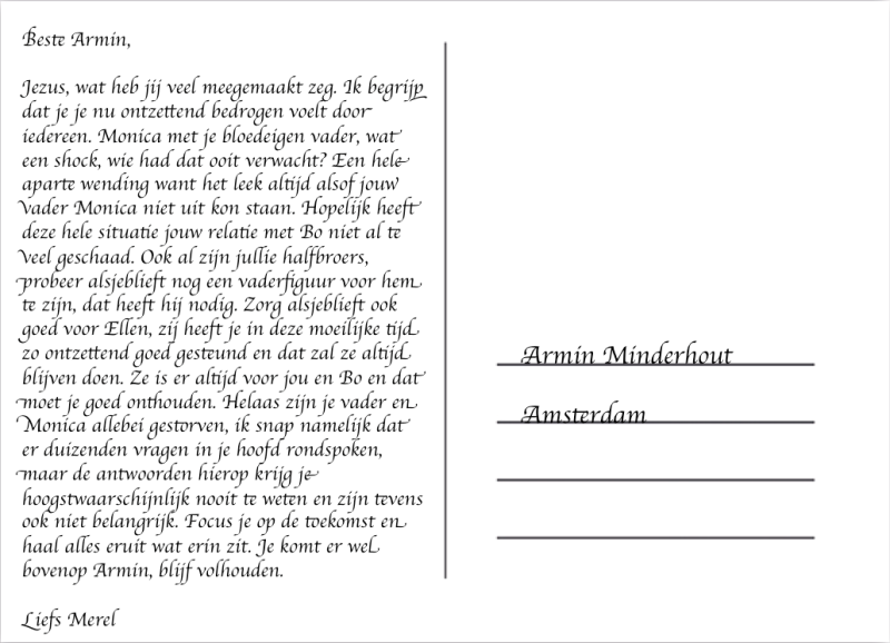 Het verhaal speelt zich vooral af in Amsterdam, waar Armin woont met Bo en Ellen. Hij woonde hier ook toen Monica nog leefde. Ook speelt het verhaal zich dus af in Ameland, waar Armin dus in een ruzie aan Bo verteld dat hij zijn vader niet is.